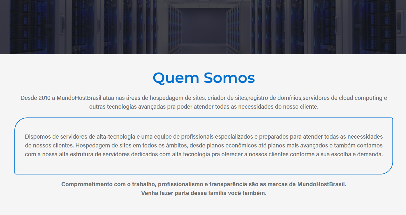 No projeto realizado para a Mundo Host Brasil, buscamos construir uma identidade digital moderna e confiável, capaz de refletir a solidez da empresa no setor de hospedagem de sites. O design foi planejado para transmitir profissionalismo e tecnologia, destacando os principais diferenciais e serviços oferecidos aos clientes.